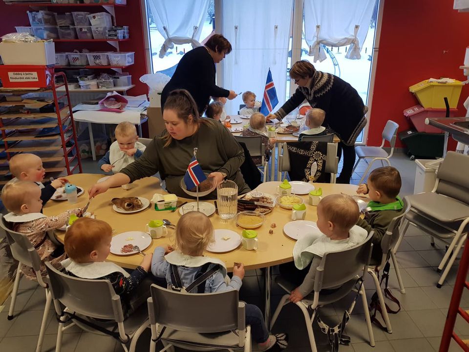 Í dag er búið að vera mikið stuð. Í föstudagssöngstundinni í morgun mættu allir með þorrahatta/kórónur og sungin voru einungis þorralög. Í hádeginu borðuðu allir saman í salnum. Á boðstólnum var hangikjöt, sviðasulta, svínasulta, hákarl, harðfiskur, flatbrauð, rúgbrauð, rófustappa, kartöflumús og slátur. Flestir smökkuðu allt en hákarlinn var það sem fáir viltu borða, nokkrum þótti hann samt mjög góður.